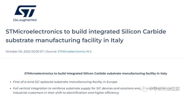 10月5日,意法半导体正式宣布将在意大利建立一个集成SiC 衬底制造工厂,以满足不断增长的需求。据了解,这座SiC衬底制造工厂与现有的SiC器件制造工厂一起建于意法半导体的意大利卡塔尼亚工厂,将成为欧洲首个批量生产150mm SiC外延衬底的工厂,预计将于 2023 年开始生产。针对扩产原因,意法半导体方面指出,汽车和工业应用中的 SiC 器件的客户正在向电气化过渡并寻求更高的效率。