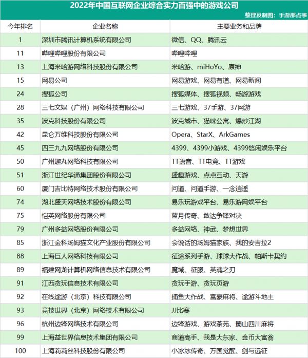 手游那点事简单筛选了下今年榜单,在互联网百强名单中,其中包括腾讯、哔哩哔哩、米哈游、网易、搜狐、三七、波克、昆仑万维、4399、趣丸、世纪华通、吉比特、盛天、恺英、多益、金科、巨人、网龙、贪玩、途游、竞技世界、边锋、益世界、莉莉丝等一共24家游戏公司入榜,约占总数的25%。