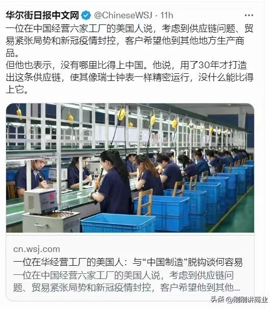 近日,华尔街日报中文网报道了一则消息:一位在华经营6家工厂的美国人说,考虑到供应链问题、贸易紧张局势以及疫情封控,客户希望他到其他的地方生产商品,他表示,没有哪里比得上中国,他用了30年时间才打造出这条供应链,使其像瑞士钟表一样精密运行,没有什么能比得上它。