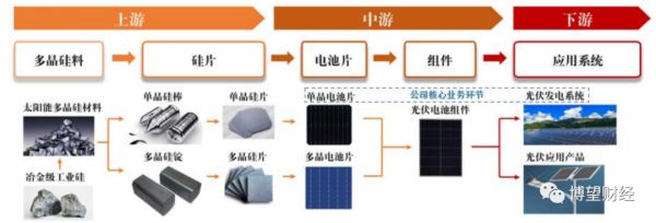 光伏产业链主要包括多晶硅料、硅片、电池片、组件、应用系统等多个环节。其中上游包括太阳能级多晶硅、单晶硅棒/多晶硅锭、硅片的生产;中游包括电池片、组件的生产;下游为光伏发电系统建造运营以及光伏应用产品制造。