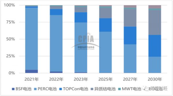 IBC、HBC等N型技术路线或钙钛矿等非晶硅技术,被称为“未来技术”,即虽然能够实现理论上更高的转换效率,但尚处于实验和验证阶段,短时间不具备产业化应用的可能性。根据CPIA预测,N型单晶硅片的市场占比将从2021年的4.1%迅速增长到2025年的25%,到2030年占比将接近50%。