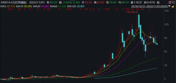 与宁德时代以及动力电池行业整体走势基本一致,亿纬锂能在2021年12月底,股价达到最高点后,连续三年的高增长终止,今年股价走势持续下滑。