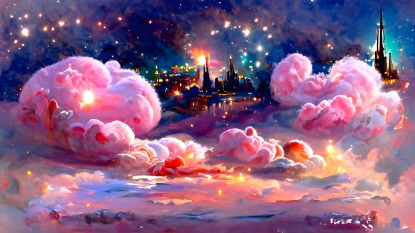 如果说AI绘画是一种魔法,那么输入的文字就是其对应的咒语,这些文字在国外的工具中被称为Prompt,汉化过来的意思就是关键词。以上面这张图片为例,它的Prompt就是“梦幻的夜空,闪烁着星星,巨大的粉色桃子云彩,远处的高塔和迷你城市 ”。