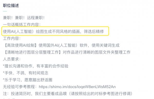之前在某招聘平台上甚至已经出现不要求绘画能力的插画师岗位,其工作内容是“使用AI(人工智能)绘图生成不同风格的插画,筛选后精修”,被网友吐槽是在给AI打下手。