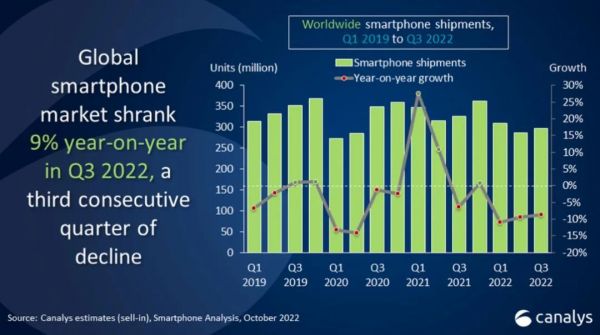 Canalys的最新报告显示,几年三季度全球智能手机出后量同比下跌9%,是2014年以来最糟糕的同期表现。在市场份额排名前五的厂商中,只有苹果的出货量实现正增长,份额也提升到18%,和榜首的三星差距进一步缩小。
