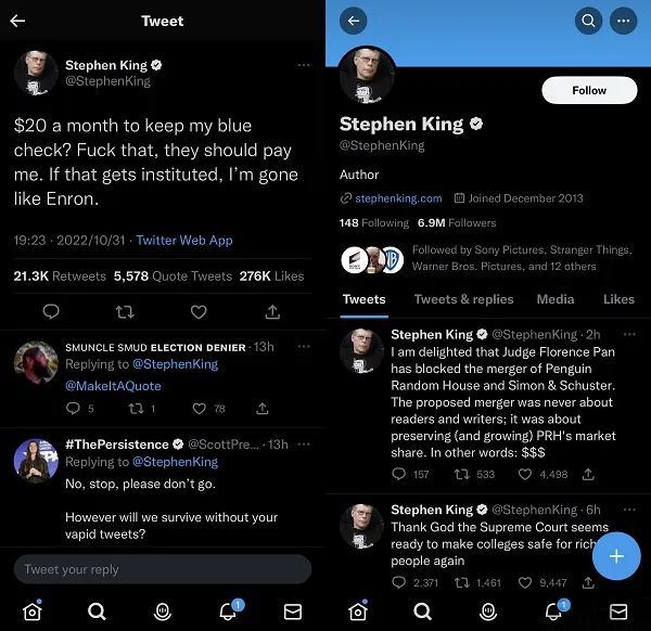 对此,著名作家斯蒂芬·金(Stephen King)在推特上表示了不满。并表示,“要每个月支付20美元才能保留我的蓝色认证吗?去他的!他们更应该付钱给我。如果这个计划真的实施了,我就会像安然公司一样消失。”随后,马斯克在斯蒂芬·金的这条推文下回复称,“我们需要以某种方式支付账单!推特不能完全依赖广告商。8美元怎么样?”