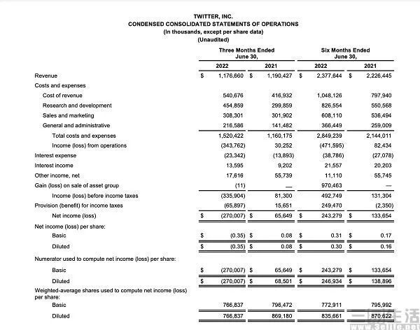 今年第二季度的财报显示,推特该季度的营收为11.8亿美元、同比下降1%,低于市场预期。其中,广告收入为10.8亿美元、同比增长2%,按固定汇率计算为6%,净亏损为2.7亿美元、上年同期为净利润6600万美元,平均可货币化的日活跃数为2.378亿、同比增长16.6%。