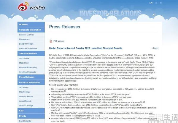 然而,如今的微博其实并没有比推特好过到哪里。根据官方公布的财报显示,2022年6月微博的DAU为2.52亿、同比增加约700万用户,与推特相当。业绩方面,微博在2022年第二季度的净收入为4.5亿美元、同比下降22%,归属于股东的净利润为2830万美元、大幅下降65%,同样也与推特这一季度的情况相似。两者唯一不同,则在于微博很早便已保持盈利状态。