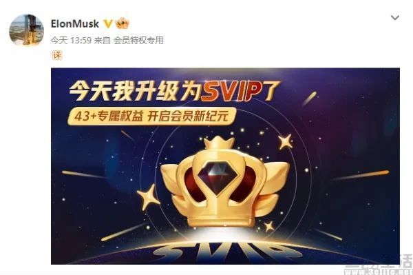 非常巧合的是,就在10月27日,与推特同为“公共广场”的微博方面宣布推出SVIP会员,较VIP会员增加了更多的权益,其中包括黑金皇冠、内容权益、稀缺装扮权益、加量改名卡、去机型小尾巴等。而在价格方面,目前仅VIP会员能够升级为SVIP,限时半价升级的价格为118元/年、35元/季、12元/月。并且就在日前,马斯克的微博账号也升级为了SVIP。
