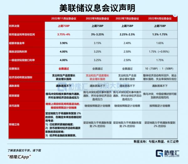 11月3日,美联储正式宣布将联邦基准利率提升75BP至3.75%-4%。