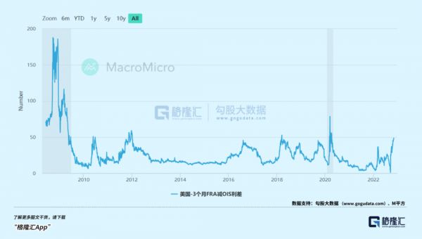在美联储本次实质性加息以及12月即将到来的加息之后,这些雷曼式的黑天鹅将会有更大的可能被引爆。目前,FRA(远期合约利率掉期,参考3月期LIBOR)-OIS利差已经飙升至48.7点,创下2020年3月爆发系统性风险前的水平。该指标代表出借资金无法归还的违约风险,息差扩大暗示银行不愿出借资金,被视为全球银行体系信贷压力上升的表现。其中不仅反映了交易对手的信用风险,也隐含了市场流动性风险。随着美联储进一步提高利率,金融系统发生“美元荒”的概率会继续增加。