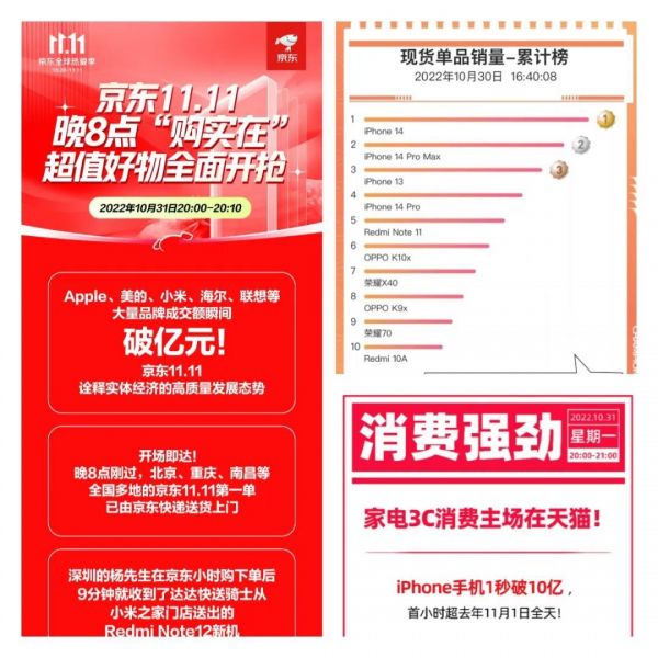 前者是9月16日开售的iPhone 14,后者是10月31日开售的小米 Redmi Note 12 探索版。