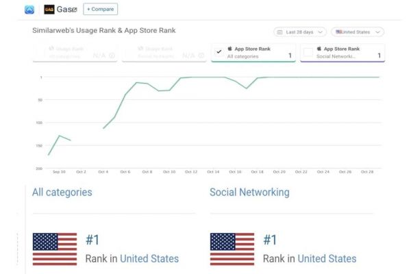 虽然目前Gas才仅开放了美国十几个州的试点,但进入10月以来,Gas已经在美国各大校园里“病毒式”传播,牢牢占据着苹果商店下载榜单的第一名,把TikTok、Instagram都甩在了身后。