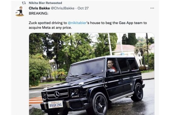 Chris Bakke发布的一条调侃推特,上边写道“扎克伯克正在开车去 @nikitabier 的家里乞求Gas App团队不惜一切代价收购Meta。”