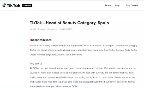 品牌工厂在TikTok官网招聘主页发现,TikTok发布了西班牙美妆品类主管、时尚品类主管、物流运营主管等12个职位的招聘信息,工作地点都在马德里。