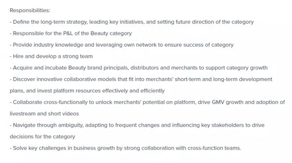 美妆和时尚品牌主管的职位的职责包括,制定长期战略,并确定该品类的未来方向;负责品类的损益;负责人才聘用,发展团队;孵化品牌负责人、经销商和商家;推动GMV增长以及直播和短视频的采用,等等。