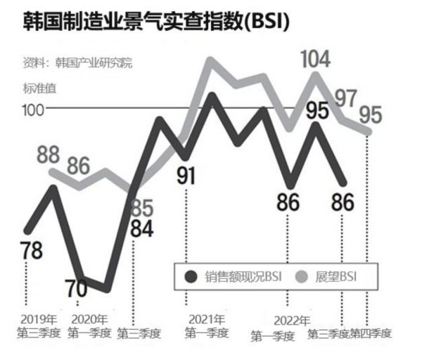今年第三季度韩国制造业销售现况BSI为86,比第二季度的95下降9个点,另外,74.8%的制造类企业预测汇率、利率和物价给企业经营带来的困难将会持续到明年。