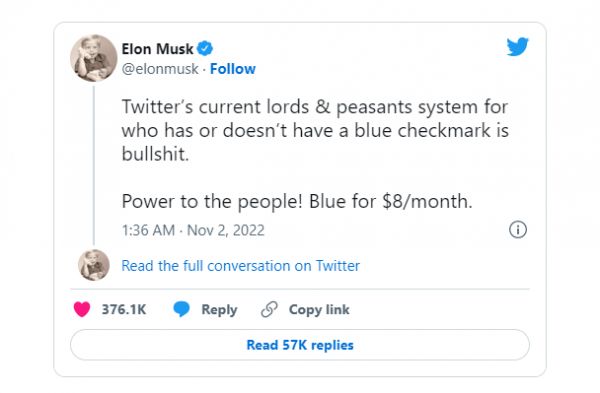 接着,在周一,马斯克在 Twitter 上正式发文称,「Twitter Blue」的订阅费用将从现在的每月 4.99 美元变为每月 8 美元,涨价 60%。
