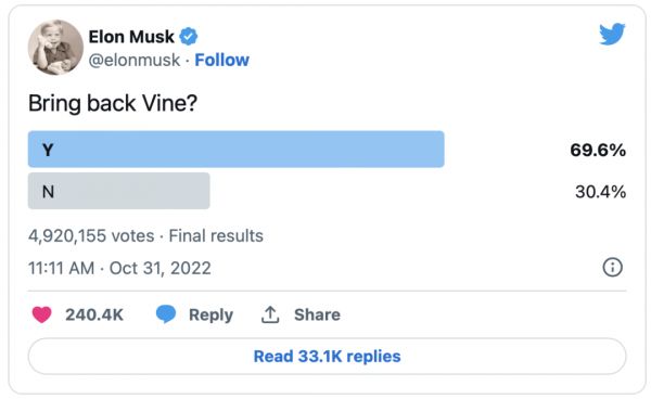 果然,10 月 31 日凌晨,马斯克就在推特上问道:「让 Vine 回归?」。但在对 200 多万人进行的民意调查中,仅有 69% 的人支持其回归。