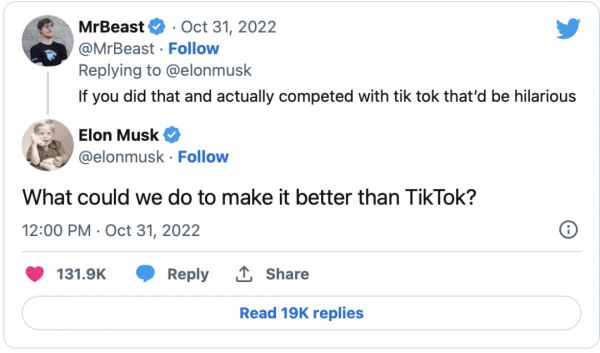 马斯克也一本正经地问回去:「我们怎样才能让 Vine 变得比 TikTok 更出色?」其言语中透露,已开始对推特的短视频业务进行规划。