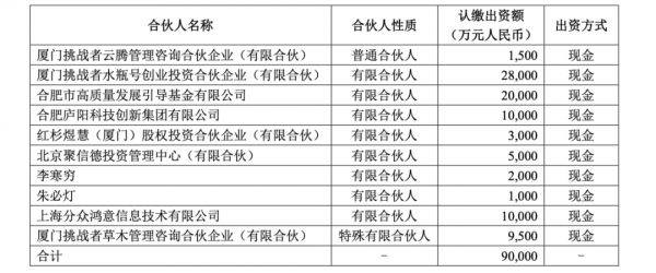 除了分众传媒之外,挑战者基金的LP还包括合肥引导基金、庐阳创新基金、红杉煜慧、聚信德、李寒穷及朱必灯(各自为有限合伙人),分别出资2亿、1亿、3000万、5000万、2000万和1000万。