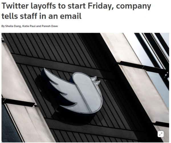 据报道,推特在周四发给员工的电子邮件中,证实将于当地时间周五开始在全公司范围裁员,员工将在当地时间上午9点前收到是否被解雇的电子邮件通知。