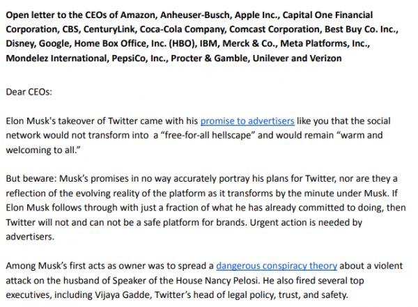 周二,40多个民权组织向推特的20家顶级广告商发出了一封公开信,敦促他们如果发现马斯克抛弃了该平台的内容审核保障措施,就暂停在推特上的广告。这封信由“自由新闻”和“美国媒体事务”等机构组织,由GLAAD和naacp等组织签署,寄给了苹果、谷歌、亚马逊、CBS、可口可乐、迪士尼、亿滋国际和宝洁等公司的CEO。