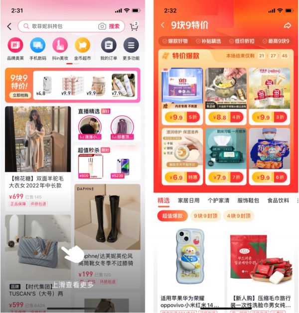 ▲抖音极速版“9块9特价”频道入口及频道内容