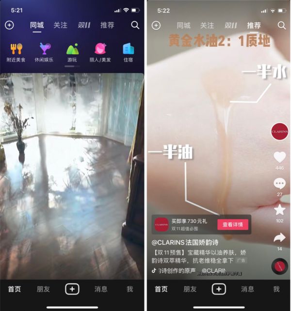 ▲抖音极速版同城页面内容及视频页面购物链接
