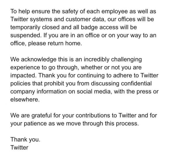 美国时间本周四(11月3日)傍晚,推特全体员工收到邮件,大致意思是说,“所有人的工牌即刻失效,周五开始裁员,安全起见,所有人周五不要去办公室,可以在早上先查邮件看看自己有没有被裁再说。”