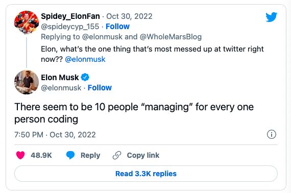 虽然这消息后来被证明真实性受到怀疑,然而在此前,当媒体问及马斯克推特“最混乱”的事情时,他暗示了其人员冗余:“似乎每1个人的代码都有10个人在管理。”