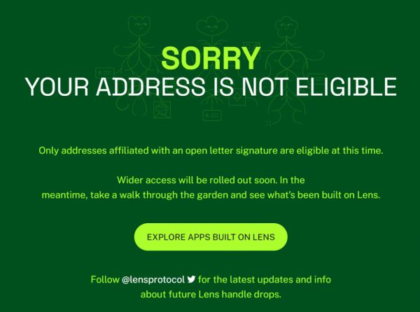 在写作本文时,我尝试了一款以 Lens 协议为基础的仿 Twitter 工具 Lenster,为此我要新建一个加密钱包(30 多种钱包里面哪个是最好的?随便哪个吧),各种关联与签约,各种同意我看不懂的条款。但我还是卡在了签署 Lens 公开信这步——我找不到签署的入口。之后好不容易,我才知道 Lens 现在相当于停止注册了。