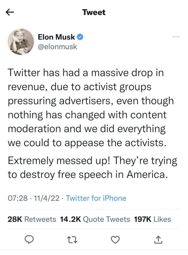在推特大裁员的当天,马斯克在推特上抨击激进团体施压广告主,导致推特广告营收大幅下滑。“即便推特内容审核没有发生任何变化,我们已经尽其所能满足激进分子。极其糟糕!他们正在试图摧毁美国的言论自由。”