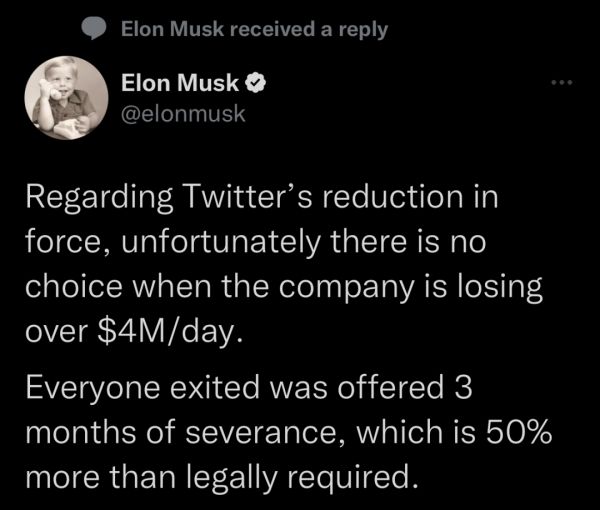 马斯克并没有和被辞退的员工沟通,但却一直在推特上进行危机公关。大裁员的当天,马斯克发布推文称,“关于Twitter的裁员,不幸的是,当公司每天亏损超过400万美元时,没有别的选择。向每个退出的人都提供3个月的遣散费,比法律要求的高出50%。”