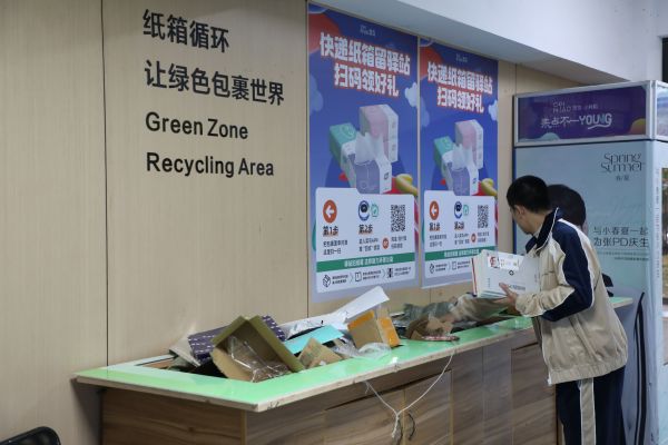 消费者通过菜鸟驿站寄出的快递中,有一半将使用旧快递纸箱。对于无法二次使用的纸箱,则会被打成纸浆再造成作业本,由公益机构送给小学生。