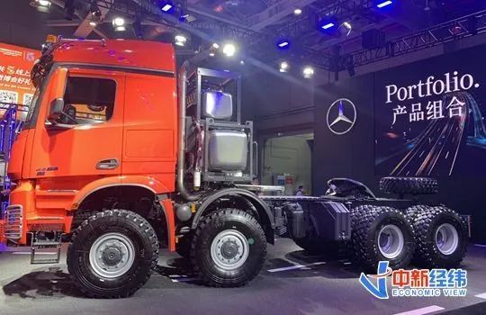 在汽车展区,不少人都被一个“大块头”吸引。作为针对重载工况特殊配置的专业车辆,此次亮相的梅赛德斯-奔驰Arocs 4863E6 8x8 SLT大件运输车可实现的最大牵引组合总重高达250吨。