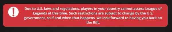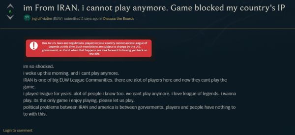 一名伊朗玩家在《英雄联盟》官方论坛贴出了他在登录时受到的提示,上面写着:“根据美国法律法规,您所在国家/地区的玩家目前无法访问《英雄联盟》。此类限制可能会因美国政府发生改变,因此如果或一旦发生这种情况,我们盼望您能回到召唤师峡谷”。