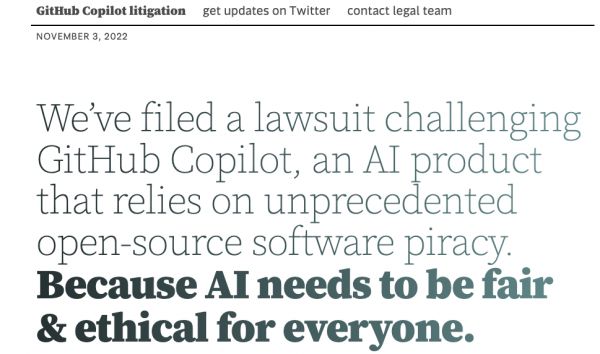 当打开页面,我们赫然可以看到一些加大的字体内容,「我们已经提起诉讼,挑战 GitHub Copilot,这是一款依赖于前所未有的开源软件盗版的人工智能产品。因为人工智能需要对每个人都是公平和有道德的。」