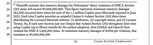 原告估计,仅被告直接违反 DMCA 第 1202 条的法定损失就将过 90 亿美元。这个数字代表了微软在 2022 年 6 月报告的 120 万 Copilot 用户中的每一个人所产生的三次最低法定赔偿金(2500 美元)。每次 Copilot 提供非法输出,都会三次违反第 1202 条(在没有以下内容的情况下分发许可材料:(1)署名,(2)版权声明,以及(3)许可条款)。因此,如果每个用户在使用 Copilot 的整个过程中(对最早的用户来说,最长可达 15 个月)只收到一次违反第 1202 条的输出,那么 GitHub 和 OpenAI 就违反了 DMCA 3,600,000 次。按照每起违法行为 2500 美元的最低法定赔偿额计算,这相当于 90 亿美元。