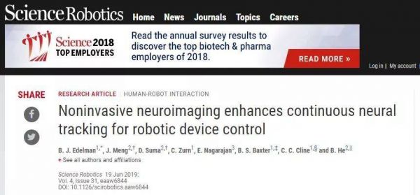 顶尖学术期刊《科学》旗下的Science Robotics专注于机器人科技前沿发展,最新一期刊登了脑机接口(BCI)领域的一项突破成果。美国卡内基梅隆大学(Carnegie Mellon University)的贺斌教授带领其研究团队与明尼苏达大学合作,成功开发出第一款非侵入式的意念控制机械臂,能够连续跟踪随机运动的计算机光标。