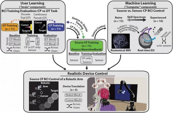 为了克服这个难题,研究团队采用了独特的解决方法:利用新型传感和机器学习技术,并通过人机相互适应的训练方法,分别增强脑机接口的“脑”部分和“机”部分,从而显著改善脑电图(EEG)源的神经解码。