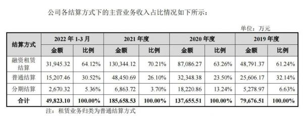 从收入情况来看,2019年至2022年1-3月,公司主营业务收入分别为7.97亿元、13.77亿元、18.56亿元、4.98亿元。自2020年起,融资租赁成为公司主要结算收入方式,为公司贡献收入超7成,以融资租赁结算为主的直销模式收入占各期主业收入比均超95%;