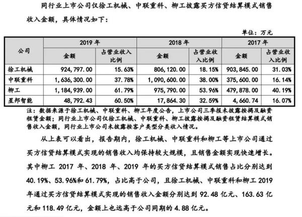 不过星邦智能在备注同行数据来源时,曾提到“同行上市公司中仅徐工机械、中联重科、柳工3家上市公司披露按揭及融资租赁结算模式销售收入金额”,由此可见,公司是将自己所提的“买方信贷结算模式”,等同于同行的“按揭及融资租赁”模式,并用这一统称下,将客户的两个模式数据加总后,与自身的“融资租赁结算”模式,进行了数据对比。