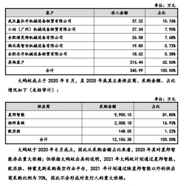 在业务结构方面,至2020年底,大蚂蚁的销售收入仅为345.99万元,采购额则达12156.38万元。值得一提的是,在大蚂蚁的主要供应商中,还包括发生违约的招科易租。数据显示,招科易租向其销售了2058.18万元的货物,占比达16.93%,仅次于星邦智能。
