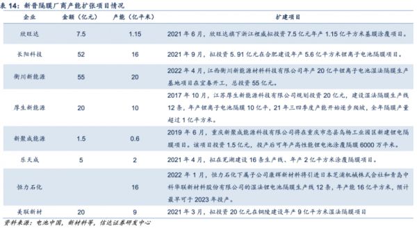 [10]《锂电产业行业专题报告:隔膜产品日益紧俏,行业扩产节奏加快》,英大证券