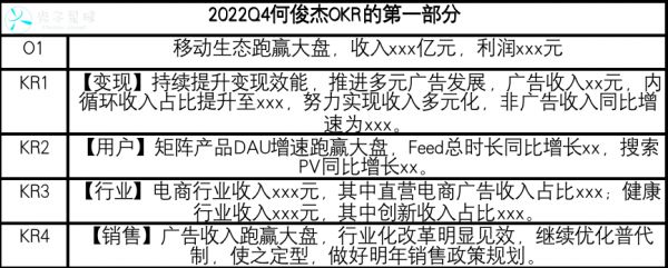 为了实现上述目标,何俊杰将O1分拆为了四个承诺型KR(相当于必须完成的结果),依次涉及变现、用户、行业与销售四个方面,这个先后次序,反映了四者的优先级。