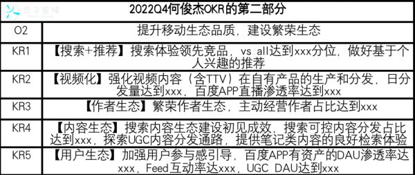 需指出,何俊杰第三个目标(O3)中的KR2实际上是向上对齐李彦宏。光子星球了解到,李彦宏2022年年度OKR的第一个O针对MEG,其中KR3为:通过AI技术,提升搜索推荐质量,推出AI powered虚拟形象,并获得xxx曝光率。