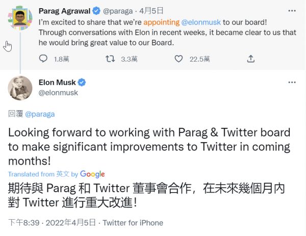 4月,马斯克成为Twitter最大股东,持有股份超过9%,自然也被受邀进入董事会,马斯克欣然回应称:「期待与Parag和Twitter董事会合作,在未来几个月对Twitter进行重大改进!」