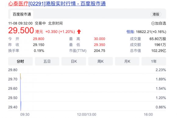 11月8日,心泰医疗在港交所挂牌上市,发行价29.15港元/股,开盘涨2.23%至29.8港元/股;截至发稿前每股为29.5港元,总市值102.29亿。