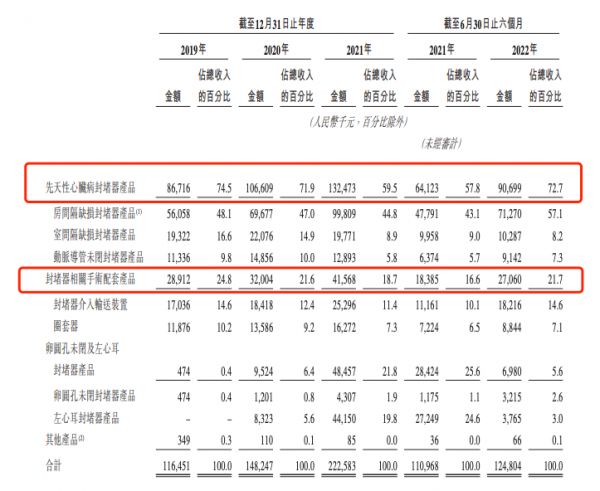 其中,先天性心脏病封堵器产品一直是公司核心业务,2022年前6个月收入占比72.7%,封堵器相关手术配套产品收入占比21.7%,合计占比94.4%。这也意味着,目前乐普心泰的业绩基本上全依赖于封堵器产品。
